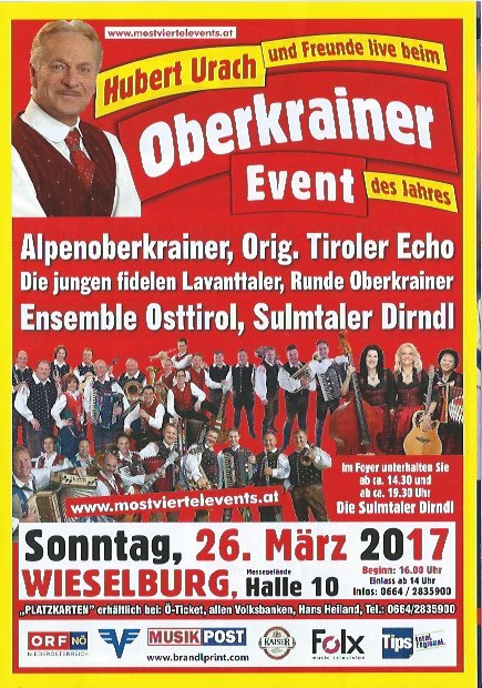 Am Sonntag, 26. März 2017, findet in Wieselburg in der Messehalle eine besondere Veranstaltung mit dem Titel „Hubert Urach und Freunde live beim Oberkrainer Event des Jahres“ statt. Neben den Alpenoberkrainern, dem Original Tiroler Echo, den Runden Oberkrainern, dem Ensemble Osttirol und den Sulmtaler Dirndl stehen auch wir jungen fidelen Lavanttaler auf der Bühne. Für beste Unterhaltung ist also gesorgt und wir würden uns ganz besonders freuen, den ein oder anderen Bekannten zu treffen.