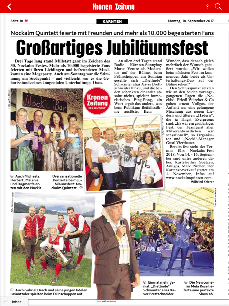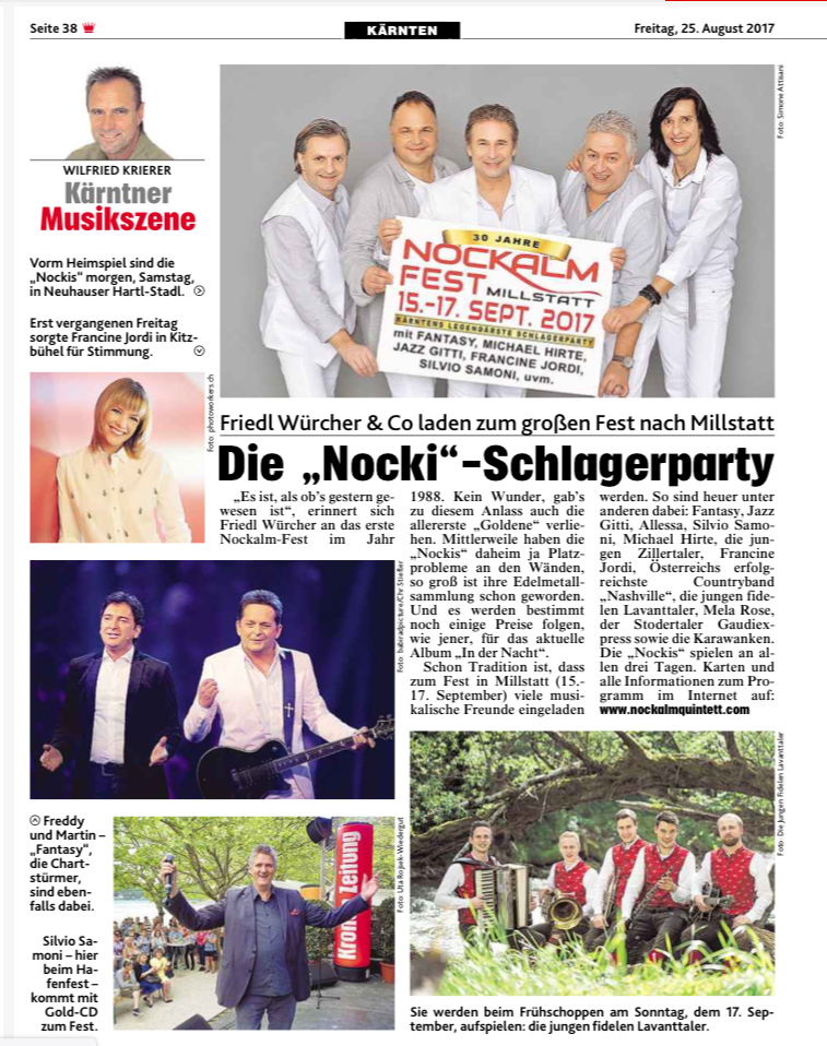 Am Sonntag, 17. September 2017, startete das Nockalm-Fest in Millstatt in seinen 3. Tag in Folge. Von Vormittag bis Nachmittag gab es Musik von den unterschiedlichsten Musikgruppen aus Nah und Fern. Ganz in Frühschoppen-Atmosphäre starteten wir am Nachmittag in unseren Auftritt und durften unseren Lavanttaler Sound vor einem Riesen-Publikum zum Besten geben – ein perfekter Tag für uns bei bester Stimmung. Ein ganz besonderer Dank geht an Viertbauer Promotion für die Einladung und die Gelegenheit auf so großer Bühne aufzutreten. Heute geht es nach Pöckau zum Pöckauer Jahreskirchtag, wer Lust und Laune hat, wir sind top motiviert und freuen uns auf euch.